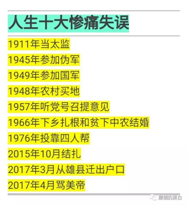 在网上看到一篇《人生十大惨痛失误》,挺有意思的。1911年乃大清灭亡的前一年,这个时候去当太监,不是惨痛失误是什么?1948年买地置产,不是等着土改时当地主吗?