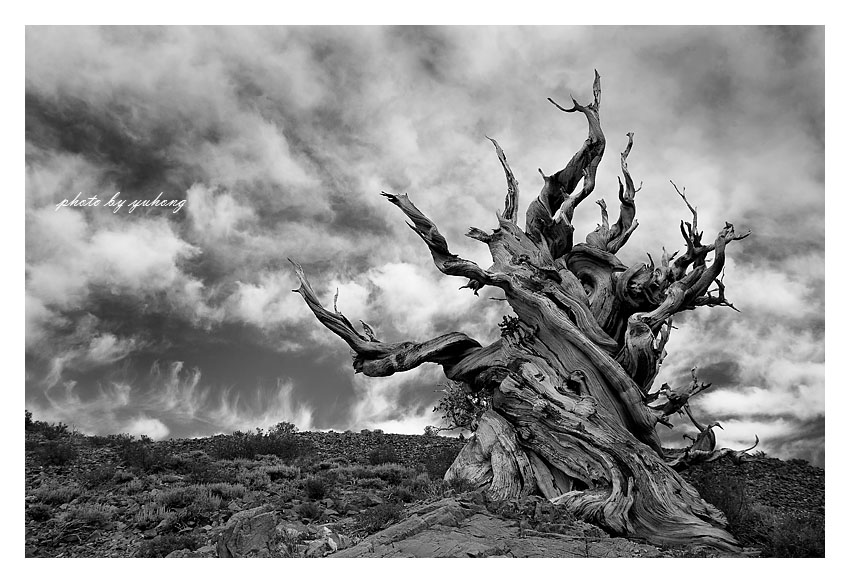 瞻仰美国下48州最高峰,惠特尼峰(Mt Whitney),我们当天晚上的旅馆订在了离那里最近的孤松镇(Lone Pine)。孤松镇不大,主要大街和US395重合,小镇赖以生存的便是旅游经济,最多的便是大小不一的汽车旅馆和野外运动用品店。中午时分我们到达孤松镇,办了旅馆入住手续,稍事休息,便继续沿US395赶往巨松镇(Big Pine)。<br><br><img src=http://photosalonla.org/phpbb3/download/file.php?id=9065><br>by Concept<br><br><img src=http://photosalonla.org/phpbb3/download/file.php?id=9272><br><br>在巨松镇我们转到168号公路和白山路。一开始还是笔直柏油马路,到后来则是弯曲的山间土路,一边是悬崖峭壁,一边是土黄色的荒山。一路逶迤地来到舒曼林(Schulman Grove),这里的海拔已经是一万英尺。开始并没什么感觉,等到我背上照相器材,往山上爬时,不一会儿便气喘吁吁,后来才知道在那个高度,氧气含量不到海平面的60%,对于平常缺乏锻炼的我来讲,的确很有挑战性。<br><br>在半山腰,我终于见到了这次拜访的对象,他们大多半枯半荣,直面着高山上强烈的阳光,勇敢地裸露着自己的胸膛,枯干的枝椏伸向午后深蓝的天空,仿佛在呼号着什么。这种张扬的个性,与我想象中智者、隐士的内敛全然不同。当然话说回来,隐士中也有信陵君访得的朱亥和张良请来的大铁锤这样的狠角色。<br><br>山上的天气说变就变,刚才天空还是碧蓝如洗,转眼便漫天的云絮。在山的另一端,Eugene发现了这最美丽的一棵。<br><br><img src=http://photosalonla.org/phpbb3/download/file.php?id=9216><br><img src=http://photosalonla.org/phpbb3/download/file.php?id=9276><br>By Eugene Xie<br><br>或保持着临死前吁天的姿势。<br><img src=http://photosalonla.org/phpbb3/download/file.php?id=9273><br><br>离开舒曼林,我们继续往上开,来到长老林(Patriarch Grove),不远处便是终年不化的积雪。<br><br>长老林十分空旷,逝去的古松或孤零零地耸立,<br><br><br><br>白山上最多是白云石(dolomite),这大约也是白山名字的由来,而白山古松便长在这白色的岩石堆中,其它植物都不能忍受这种碱性土壤。但在没有白云石覆盖的地方,生长缓慢的白山古松又竞争不过那些普通灌木。说到底白山古松不过是像熊猫那样的进化的孑遗,作为一个亚种,他们仅分布在白山一带:有时隐士的与世无争,也许是无法竞争。<br><br>夕阳下,残阳如血。<br><br><img src=http://photosalonla.org/phpbb3/download/file.php?id=9274><br><br><img src=http://photosalonla.org/phpbb3/download/file.php?id=9304><br>By Eugene Xie<br><br><img src=http://photosalonla.org/phpbb3/download/file.php?id=9317><br><img src=http://photosalonla.org/phpbb3/download/file.php?id=9315><br>By Fangcy<br><br><img src=http://www.pbase.com/xianren5588/image/100640921/original.jpg><br><img src=http://www.pbase.com/image/99797324/original.jpg><br>By Xianren558<br><br>待续)