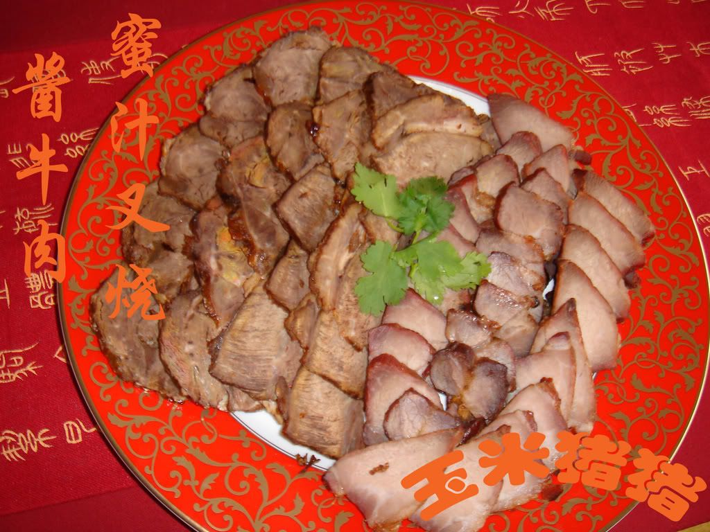 ;李锦记叉烧酱;糖,酱油(老抽);料酒;大曲别针(若干) 做法: 1. 猪肉切成大长条 (约 10 公分长) 2. 把切好的肉加糖(多加,广式叉烧偏甜),料酒,酱油(老抽),李锦记叉烧酱腌入味(我一般在冰箱放过夜)<br /><br /><img SRC=http://i305.photobucket.com/albums/nn207/cornpiglet/niancai029.jpg?t=1217904489 width=320 height=240><br />3. 烤箱预热 375F/190C 4. 把曲别针拧成 S 型,一头串上肉条,一头挂在烤箱的架子上,下面要放一个烤盘接着,烤的时候会有汁水滴下来<br /><br /><img SRC=http://i305.photobucket.com/albums/nn207/cornpiglet/niancai042.jpg?t=1217904714 width=640 height=480><br />5. 375F/190C 烤 50 分钟<br /><br /><img SRC=http://i305.photobucket.com/albums/nn207/cornpiglet/niancai044.jpg?t=1217904859 width=640 height=480><br /><br />酱牛肉 材料:牛腱1条;葱2根;姜1块调味料:酱油(生抽,老抽);糖;盐;大料(八角)1枚;料酒 做法:1. 牛腱洗净,放冷水中煮开,去血水2. 另起一锅加水煮开,加调味料(咸淡随意),葱切段,姜拍散放入锅中3. 把去过血水的牛腱洗净放入锅中,开锅后,小火焖煮2-3个小时4. 煮好的牛腱在汤中泡过夜(这样会更入味),第二天捞起沥去汤汁,放入冰箱(冰过比较好切),上桌前切片摆盘)
