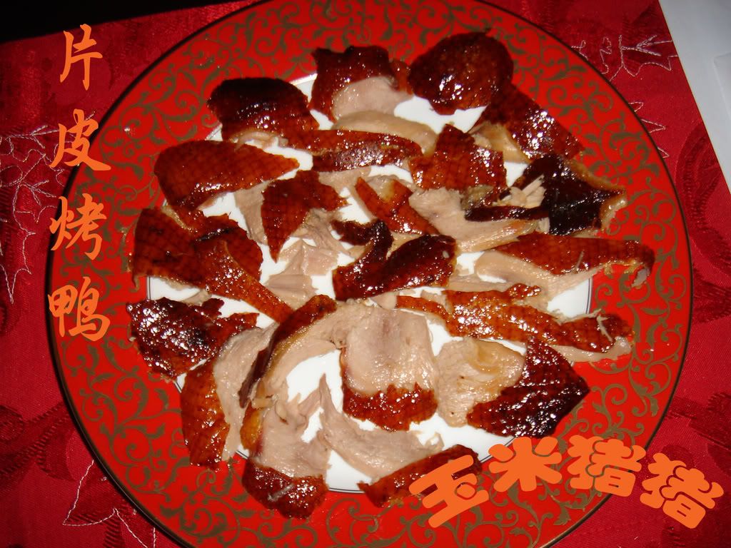 <br />第一天:腌鸭子<br />鸭子化冻,洗净,拔去残毛。里里外外抹上盐和料酒,用保鲜膜包好,放入冰箱腌2天<br />第三天:吹气 - 烫鸭子 – 晾鸭子<br />1. 吹气 – 腌好的鸭子用吸管从脖子处插入皮内,吹气,使皮肉分离 (我这次买的鸭子不是太好,一是没头,二是鸭腿处的皮是撕裂开的,所以我这次就省略吹气这一步骤啦)<br />2. 烫鸭子 – 烧一壶加一大锅滚水;把吹好气的鸭子放入洗菜池;先用水壶浇滚水(各个部位都浇到),再把一大锅滚水一气浇上去;滚水烫过的鸭子皮会很爆满,好像要胀破的感觉<br />吹气和烫皮的过程会让烤过的鸭皮变很脆<br />3. 晾鸭子 – 烫过的鸭子用绳子从翅膀下绑好,挂起来风干。(我家厨房的水池上正好有2个柜子把手,我一般把鸭子挂在这,如果无法挂在水池上,下面要记得方格小盆接血水<br /><br />这是刚挂起来的时候<br /><br /><img SRC=http://i305.photobucket.com/albums/nn207/cornpiglet/niancai019.jpg?t=1217647122 width=640 height=480><br /><br />来张远景<br /><br /><img SRC=http://i305.photobucket.com/albums/nn207/cornpiglet/niancai018.jpg?t=1217647197 width=640 height=480><br /><br /><br />这是48小时后的鸭子,可以看到皮已经很干很脆了<br /><br /><img SRC=http://i305.photobucket.com/albums/nn207/cornpiglet/db07594d.jpg?t=1217647582 width=640 height=480><br /><br />第五天:烤鸭子 – 片鸭子 – 鸭架汤<br /><br />烤鸭子<br />1. 烤箱预热375F/190C<br />2. 把枫树糖浆和蜂蜜调成一小碗酱,用刷子刷在鸭皮上<br />3. 苹果洗净,切4块,面包蘸水,把苹果和面包塞到鸭肚子里头<br />4. 把鸭子放在有架子的烤盘上,鸭腿,翅膀和鸭头(如果有的话)用锡纸包好(防糊)<br />一定要用有架子的烤盘,这样烤的过程中水和油滴下去才不会沤到鸭子,皮才会脆。<br />5.总共烤一个半到两个小时,但是每30分钟要刷一下蜂蜜和枫浆,然后翻个面,最后半小时要注意防糊<br /><br /><img SRC=http://i305.photobucket.com/albums/nn207/cornpiglet/3aba5d55.jpg?t=1217647378 width=640 height=480><br /><br />片鸭子<br />这是我家LD的活儿,刀一定要利,要尽量做到每一片都有肉有皮<br />另准备黄瓜条1盘;葱白丝1盘;甜面酱1盘;春饼若干<br />(我这次应为来不及烙饼,提前买了冻的木须饼。匆忙之中黄瓜,葱丝,酱和饼都没照相)<br /><br />鸭架汤<br />片完肉的鸭架加水煮汤,汤开后加盐和料酒调味,放入冻豆腐,熬大约1个小时,快起锅时加白菜,就是美味的鸭架汤<br /><br /><img SRC=http://i305.photobucket.com/albums/nn207/cornpiglet/31d3b946.jpg?t=1217647490 width=640 height=480><br /><br />)