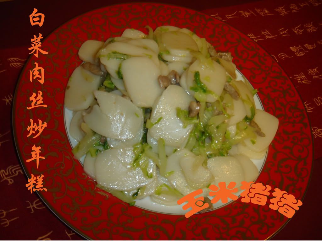 5.另起油锅,炒白菜,白菜半熟时放入年糕片,加盐,糖,酱油调味