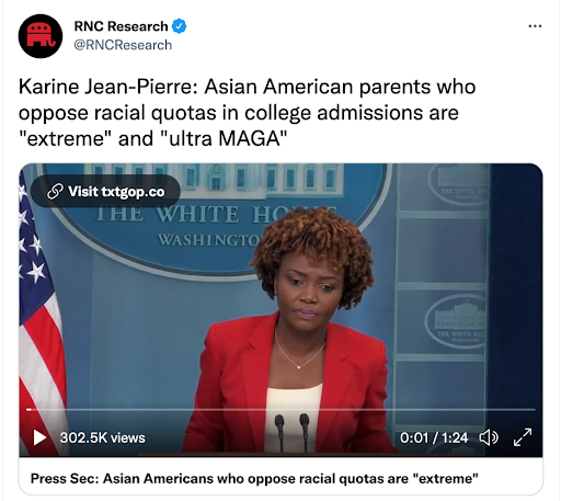 美国最高法院今年秋天将审查针对哈佛大学和北卡罗来纳大学教堂山分校的两个与《平权法案》(AffirmativeAction,简称AA)相关的案子。大学的AA政策一直是在美华人特别关心的一个话题,这次高院接受这两个案子对亚裔社区也算是一件大事。不久前,一个叫RNCResearch(共和党全国委员会研究)的推特账号发了个推文,说白宫发言人卡琳·珍·皮埃尔(KarineJean-Pierre)在答[