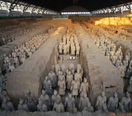 图坦卡蒙法老墓1.秦始皇兵马俑(发现地及时间中国西安,1974年)中国第一个皇帝秦始皇在驾崩之前统一了中国,下令修建长城,对中国实行残酷统治。他当时唯一惧怕的是天帝的震怒。他为此下令修建一座庞大的陵墓,让8000名真人大小的彩绘武士守卫。有人说,秦始皇陵的顶部是玉石制成的,墓室内有流淌的水银组成的河流。经过了70多[