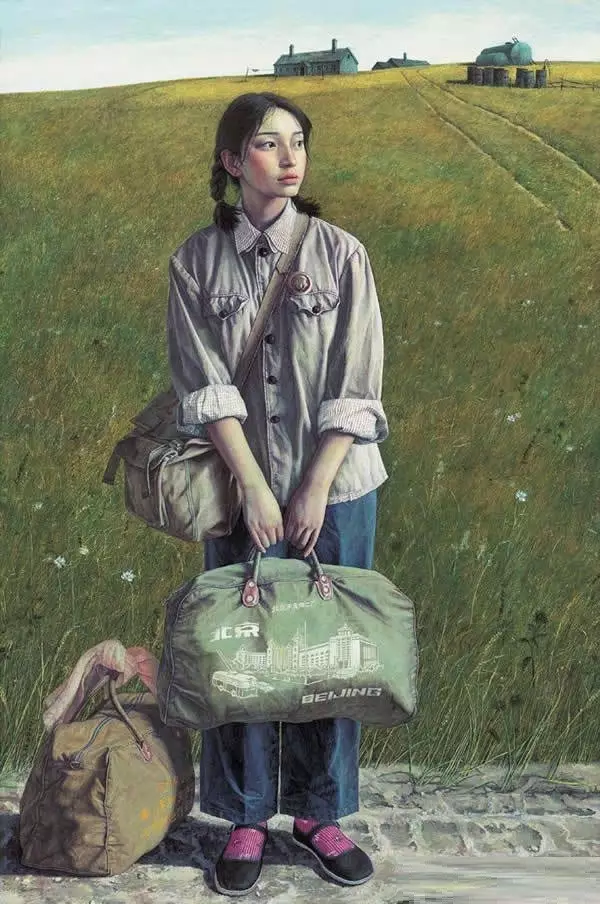 油画《我的前夫》,原名《青春之歌》,是当代知名画家王国斌先生知青系列油画中的代表作。画中的新娘和新郎,端坐在土窑洞前,新娘是位回城绝望的女知青,新郎是村里男人中的幸运儿。他们的婚姻注定被政治操弄,当回城的机会来临,便永生不再见。