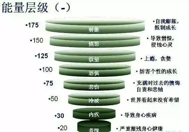 著名心理学家DavidR.Hawkins分析了各类情感的能量等级,从最负面、伤身的情感,到最正面、滋润的情感,所有情感里面,排最低的不是愤怒、悲伤、恐惧;排最高的不是骄傲、勇气、真爱,那会是什么?按:能量等级从0到1000;200以下为负面,200以上为正面。