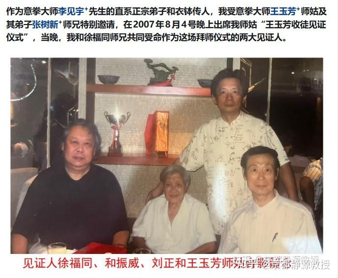 作为意拳大师李见宇先生的直系正宗弟子和衣钵传人,我受意拳大师王玉芳师姑及其弟子张树新师兄特别邀请,在2007年8月4号晚上出席我师姑“王玉芳收徒见证仪式”,当晚,我和徐福同师兄共同受命作为这场拜师仪式的两大见证人。当晚师姑王玉芳所收徒弟七人,其中包括带艺拜师的王成(拳击、摔跤等,自号天石王成、江湖诨号天屎王八)。鉴于王成近期(2025年11月[