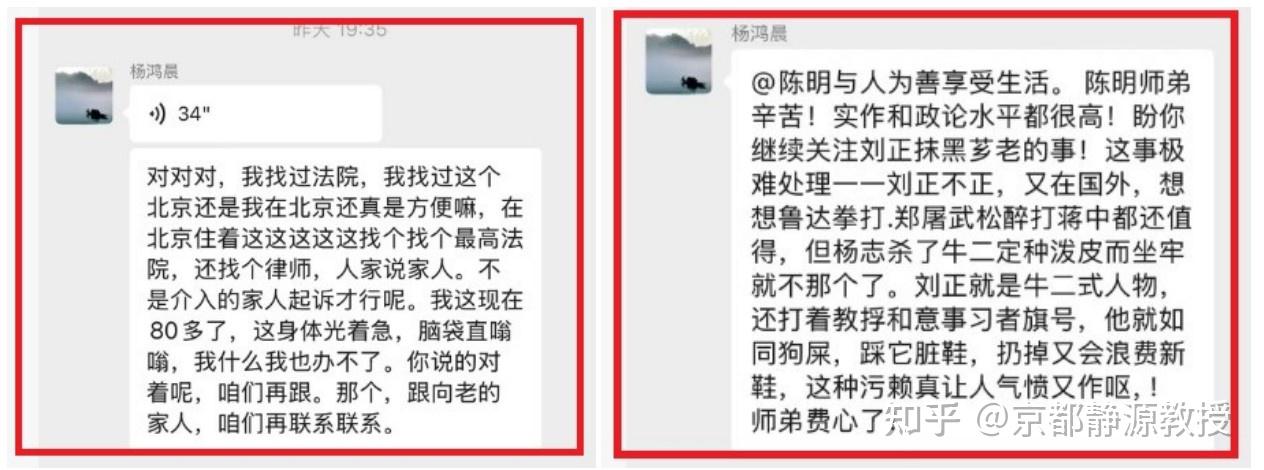 “牛大杨鸿晨”见信如面:为什么称你是“牛大杨鸿晨”呢?是因为你主动寻衅滋事称我为“牛二刘正”。按照咱俩的辈份在意拳界都是第三代,你至今80多岁了,我60多岁了,我很高兴被你称为“牛二刘正”,照单全收,那么对于你这样的牛人,我就东施效一把颦,称你是“牛大杨鸿晨”了,希望你也照单全收。见你在意拳大会微信群的发言截图[