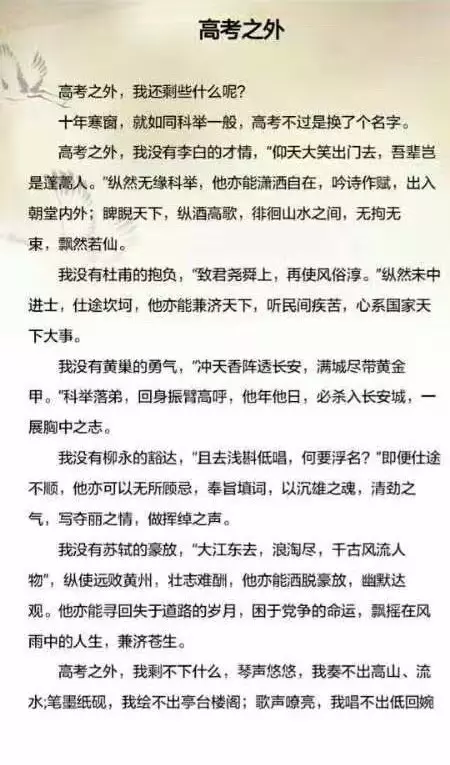 今天看到@四十尺客栈王姐分享了她侄儿的一篇获奖作文:“在机场读高三侄儿子的获奖作文【高考之外】,华丽的排比之后,惊心地看到节束语——高考之外,我一无所有。家门上用磁扣贴满了他的奖状,理工男的目标是北大。昨晚的家宴上,可能疲惫可能生疏,他没有声音也少有笑容。高考,需要如此消耗人的青春吗……”理科男小伙子文笔了得,洋洋[