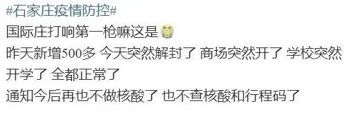 邱开冒一丘千万壑2022-11-1507:47Postedon山东昨天,有消息说石家庄在单日新增阳性超过500例的情况下“解封”,出小区、到很多地方都不再看核酸,很多核酸点也取消了,网上出现了惊悚标题——“石家庄打响了第一枪!”弄得跟黄花岗起义似的。石家庄只是严格落实《二十条》,不要求全员强制核酸检测,只对重点人群及重点工作岗位施行核酸检测。这都是在[