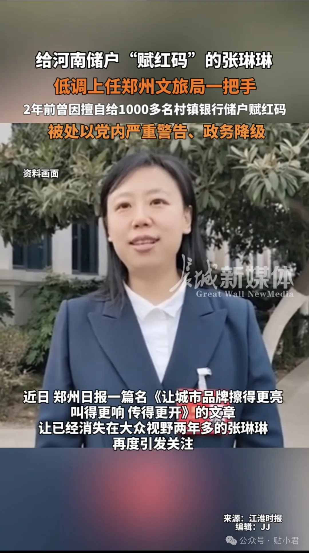 https://mp.weixin.qq.com/s/FC90gEFwv_pWJwfcdve4KA因擅自给1000多名村镇银行储户“赋红码”被问责的张琳琳,有了新身份。Original贴小君贴小君2024年08月21日18:07给河南储户赋红码的张琳琳,低调上任郑州文旅局一把手。2年前曾因擅自给1000多名村镇银行储户赋红码,被市纪委处以党内严重警告,政务降级。