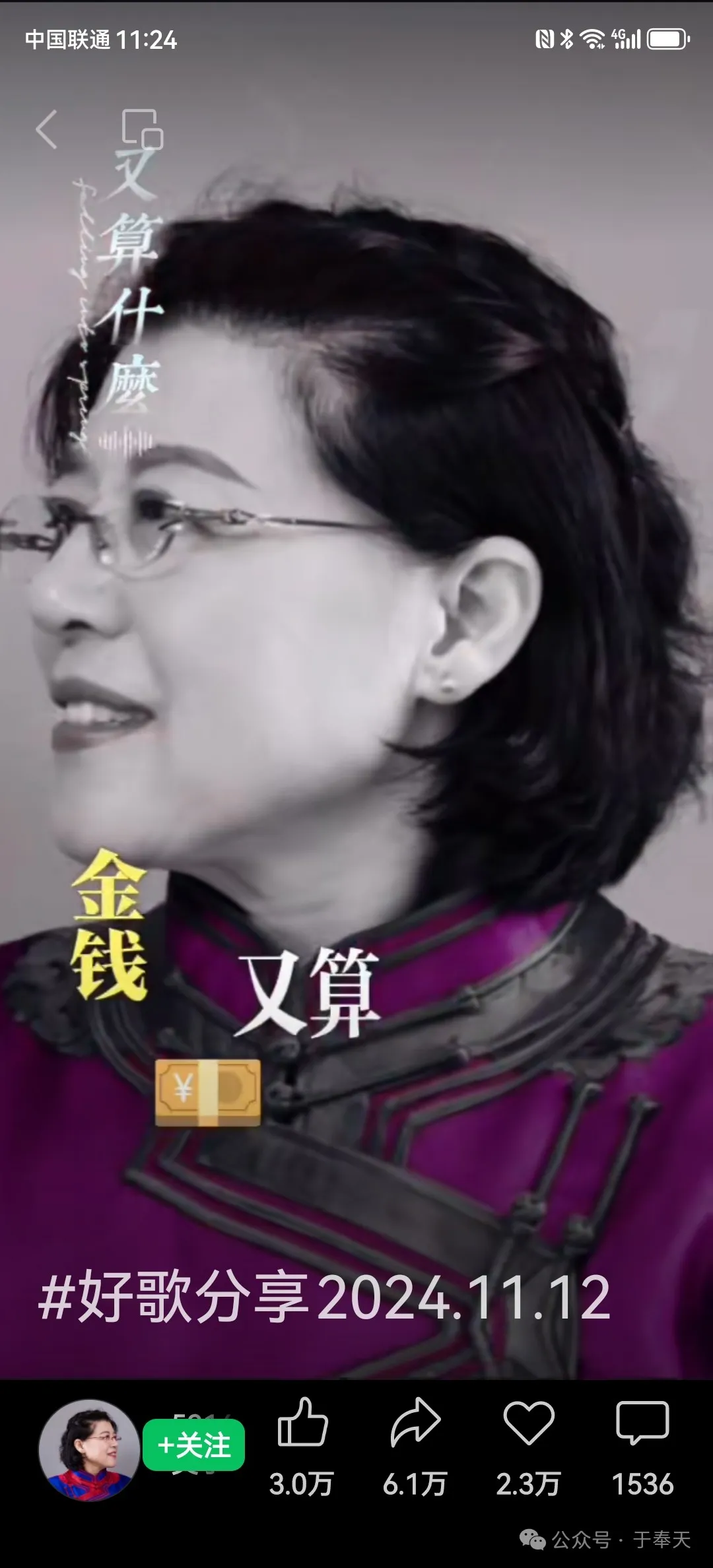 https://mp.weixin.qq.com/s/q-SpgYsOmL1v2aAhu4YB6A“算什么”Original于奉天于奉天2024年11月13日21:29看短视频,是我生活习惯。不能拒绝。但也常感无聊,将自己只做无用的消费。心中难免生出沮丧和自卑。然而,却改不掉。文章标题,“算什么”三个字,就没头没尾。这是刀郎不知什么歌中的歌词。视频只截取四句“算什么……”,其余一时无法找到。因此,我便[