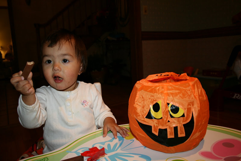 等我们吃完晚饭后,爸爸和妈妈也带如如去要糖了。如如在邻居奶奶家拿了第一块糖后,就开始非常兴奋,一路小跑,摔倒了也顾不得撒娇,起来再跑。到人门口,自己口齿不清地说“trick-or-treat!”然后不客气地拿一个糖,妈妈赶快在边上说:say “thankyou!”如如就跟着说:"thank you!" (爸爸说,听起来象:“letsgo!”,妈妈觉得更象:"囡Q"!哈哈)。然后不用妈妈教,自己跟人一挥手,说:"byebye~~"。那个cute是人见人夸,妈妈得意的不得了。后来到邻居家比如如大两个月的小哥哥家去拿糖时,阿姨给完了糖,又兴奋的跑到家里头找来相机,给如如拍了照才肯让我们走,后面等着要糖的人都排成队了!