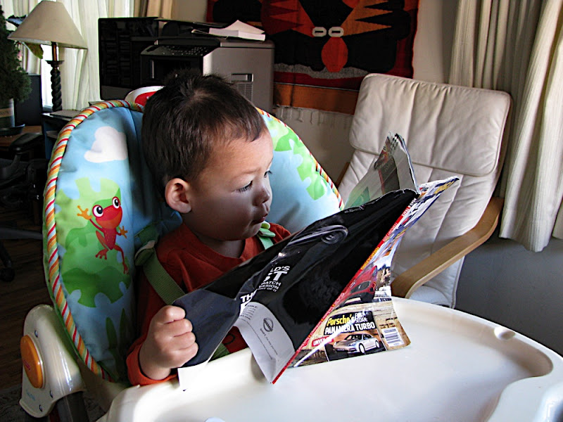 阳阳自从15个月在国内的飞机上看到一本有汽车广告的杂志,就突然疯狂地爱上汽车。曾经有几次,我把家里所有的小车玩具和书都藏起来一两个星期,想让他接触一些别的东西。他能把小书架上所有的书都翻遍,只要能看到半个轮子,他都抱着书不肯放手。他很清楚的知道哪本书的哪一页有汽车。当然上街的时候,满眼都是汽车,我藏不住。后来就怀疑嗜车是他的天性。别的同龄男孩也喜欢车,但我没见过象他这样疯狂的。