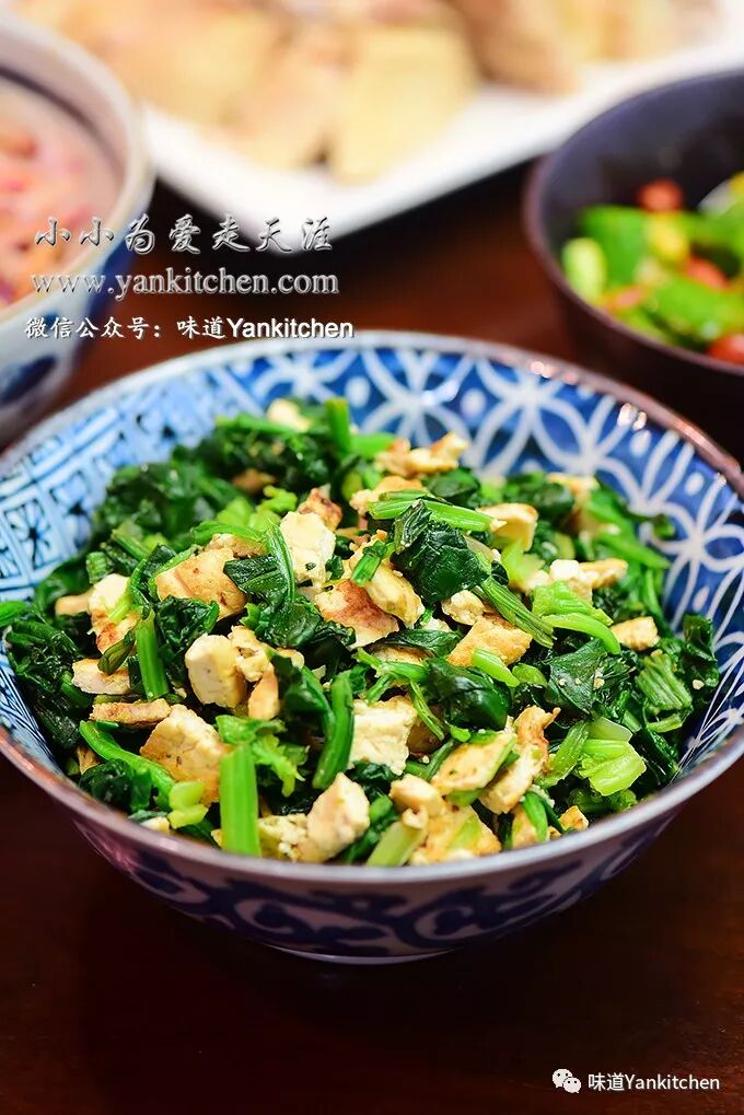 菠菜汆烫过,切碎,豆腐油煎至两面金黄,切小块,跟菠菜一起,拌入调料就行,简单又爽口。