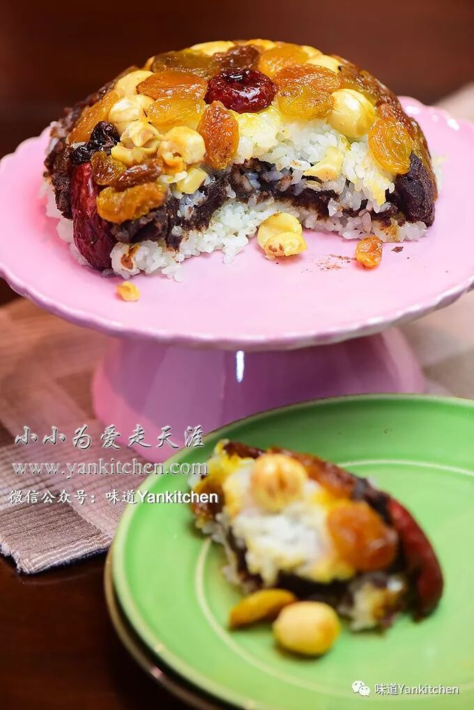 豆沙提前一天炒好,在碗里抹点油,在碗底先铺上一层葡萄干,莲子和红枣,放一层拌了糖和猪油的糯米饭,一层豆沙,最后再盖上一层糯米饭,压实,上锅蒸25到30分钟,然后倒扣装盘。