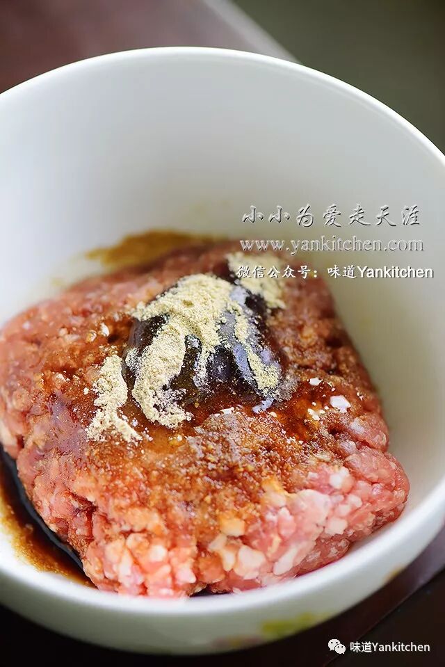 将猪肉末在放在一个碗里,加入姜粉,料酒,蚝油,生抽,白胡椒粉和盐,用筷子往一个方向猛搅。