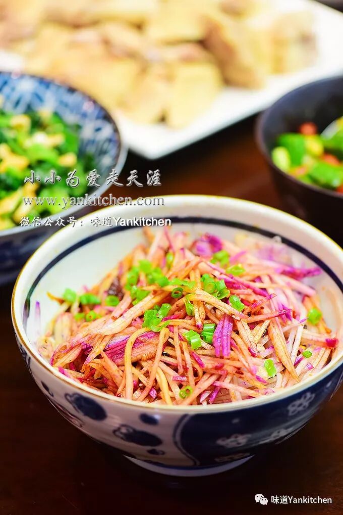 特别美的紫色萝卜,本来要做糖醋萝卜丝的,切萝卜的时候,尝了一口,又脆又嫩又甜,几乎没什么萝卜的辣味,所以直接改成了凉拌萝卜。