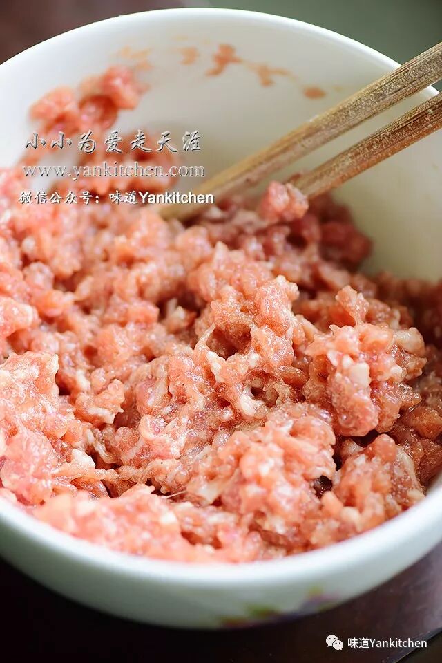 在搅的过程中分四五次加入高汤/ 水,一直搅到肉馅起胶上劲。