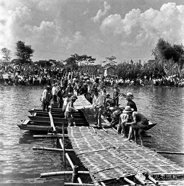 1972年,南通市人武部响应毛主席号召“备战,备荒为人民”,组织民兵架浮桥演习。晓庄/摄。