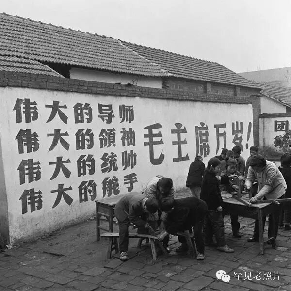 1966年,太仓县沙溪公社小学墙上的大标语,墙上都是伟大的形容词,学生在老师带领下为学校修课桌。晓庄/摄。