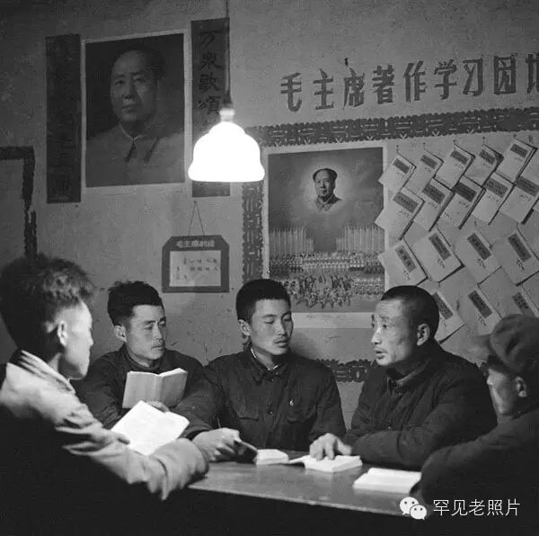 1966年,江宁县方山公社横岭大队党支部成员晚上集体学习毛主席著作。晓庄/摄。