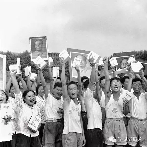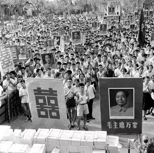 1966年,南京市新华书店送红宝书到南京大学,学生们集会隆重迎接红宝书。晓庄/摄。