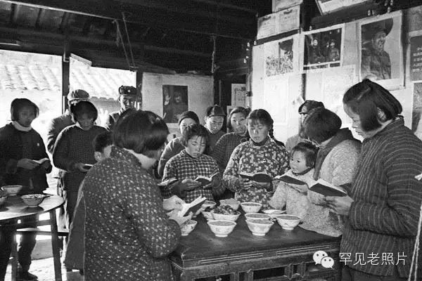 1966年,太仓县沙溪公社洪泾大队食堂里, 吃饭之前先学习毛主席语录。晓庄/摄。