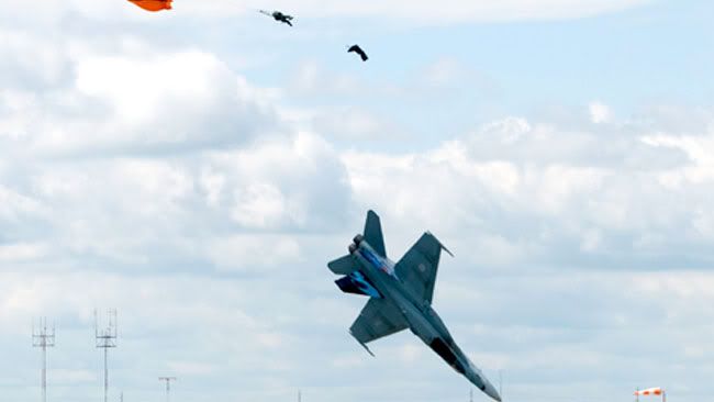 当时还想着那些飞行员够牛逼,几秒钟内,那飞机几乎从天上直冲地面。这是表演飞行员的技术呢,还是飞机的性能? 正想着尼,只看见一个小小的降落伞飞出了机舱,意为这也是表演的一部分。当时还纳闷,在这么低的情况下,跳伞,降落伞根本还来不及打开,人就要落地了,这也太危险了。