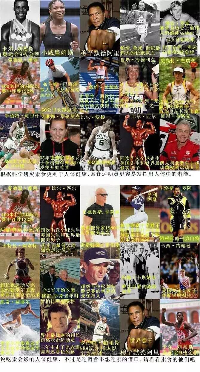 ※ 拳王穆罕默德•阿里(Muhammad Ali),17岁出道,18岁获得奥运金牌,20年的职业生涯中,22次获得重量级拳王称号,10次蝉联拳王称号,保持长达12年时间正式比赛不败的纪录,奥委会授予“20世纪最伟大的25位运动员”之一。他的一拳可以打出400多磅的份量。阿里生前一直坚持吃素,并大力推广素食主义。拳王阿里曾直言,他平时的食物主要以不同蔬果为主,肉类是肯定不会吃的,虽然他经常要接受高强度的训练、比赛,但他认为素食使他更有活力,非但不会影响体力,还可以保持精力充沛,所以才能屡创佳绩。在阿里的带动下,他的老对头泰森于2010年也开始逐渐吃素,到后来,泰森直言,当他吃下一丁点肉时,就会有恶心呕吐的感觉,让他领悟到,肉对他来说已经是毒药。泰森同时说,吃素让他领悟到他必须更加谦虚,并表示是他这一生最无忧无虑的时光。