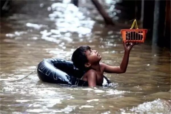 男孩在洪水中救了他的猫。