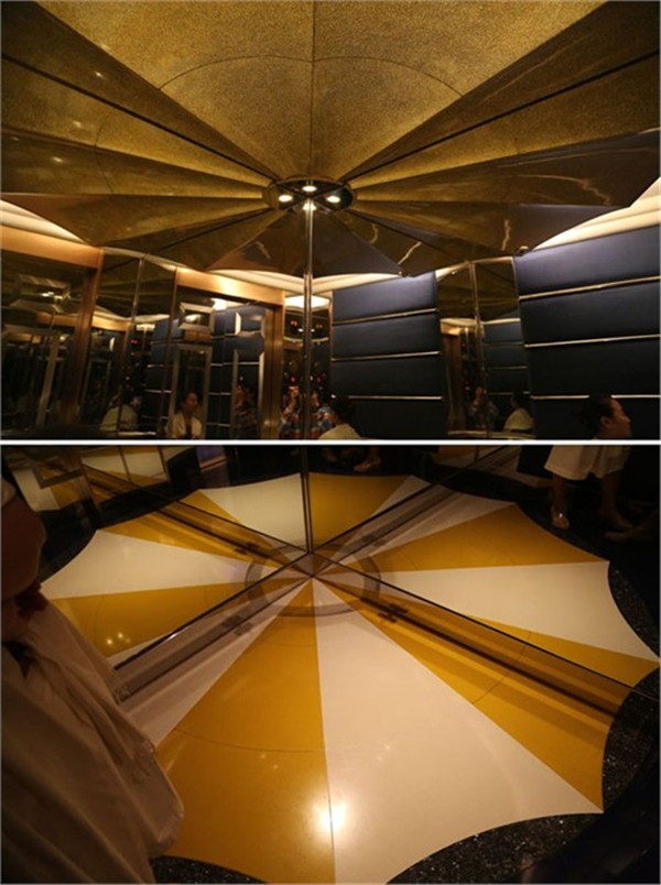 电梯的设计简单却不乏创意:其实看似完整的圆,其实只有四分之一大,经过镜面反射而成。