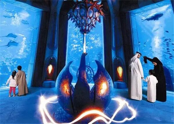 水族箱背景则是传说中沉陷的亚特兰蒂斯废墟,断柱残垣,及史前文明的飞船碎片,装点出酒店主题,使这个水族馆区别于一般海洋馆的科普特征,而具有文化意味和历史感。