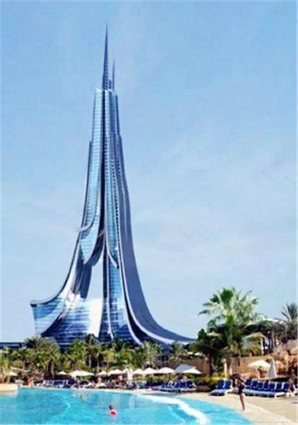 比世界第一高的哈利法塔低了约500英尺。125层,总高度达700米。形似风力发电机的装置是餐厅。