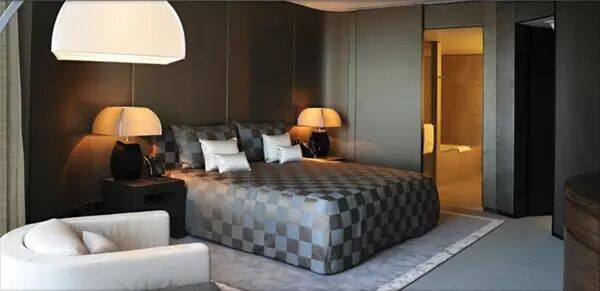 房间里所有摆设、用品、设施,全部出自阿玛尼品牌。墙面居然是丝绸!太奢侈了。