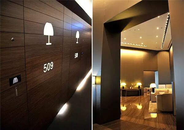 酒店整体都是简约现代的线条感设计。客房的门牌号完全跟木质墙体结合在一起,没有门把手,刷卡之后往里推门即可。据说酒店内所有的独特设计都是听从台湾风水大师的建议。