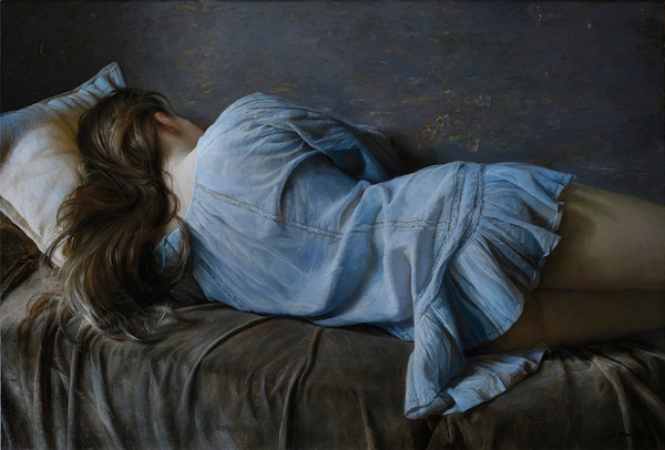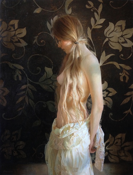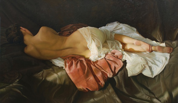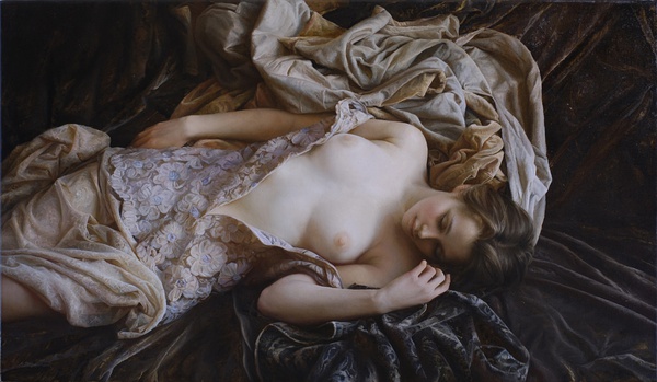 蒙老大启蒙,我去古狗了这个青年画家一下。他的画风同当代Jeremy Lipking的裸女图颇有相似之处。外行看来,除了他的笔触更细腻以外,还有个很大不同就是虽然他的人物通常比Lipking少画一“点”,但多画了凌乱的被子,令俗人更生遐想。哈哈。我确实俗得不可救药。自己面壁去了。