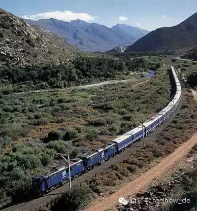 蓝色的火车,一路可见瀑布流泻、种满向日葵的农场和鸵鸟出没的山谷,中途停靠著名的金矿所在地,入夜月亮从沙漠上升起,翌日早晨驶过美丽的葡萄园,最后映入眼帘的是桌山(TABLE MOUNTAIN)。行程27小时,保安严密。