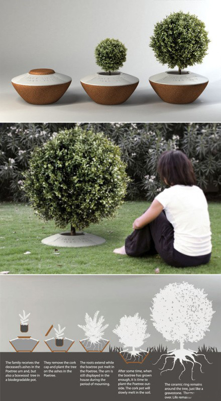 印度工业设计学生MargauxRuyant设计的一个诗意的骨灰盒“POETREE”。主体由软木和陶瓷制成,将骨灰,泥土和树苗一同种下,当小树逐渐长大,软木则分解在土壤中。