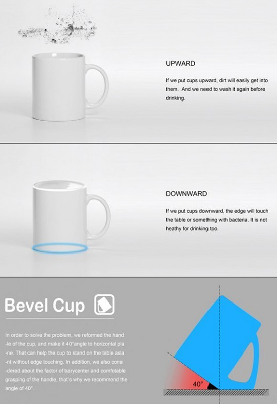 BevelCup。2012年获得红点奖,解决了杯子的摆放存在的问题,即杯口向上灰尘会进入杯子、倒扣着杯子杯口直接接触桌面。灵感来源于芭蕾舞演员角度的锥杯,利用把手上的一个面的角度使得杯子既不会向上接灰尘也不会朝下接触到任何让你不放心的东西。