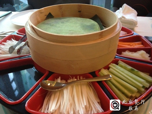 挑食理由:烤鸭采用的挂炉方式烤制,配以八宝调料盒,第一口要吃鸭皮蘸蓝莓酱和跳跳糖,口感很特别;第二口可采用传统吃法,用蔬菜汁做成的绿色春饼;第三口可随意搭配,把蓝莓酱、洋葱、胡萝卜、蒜泥什么都统统放入。258一只。