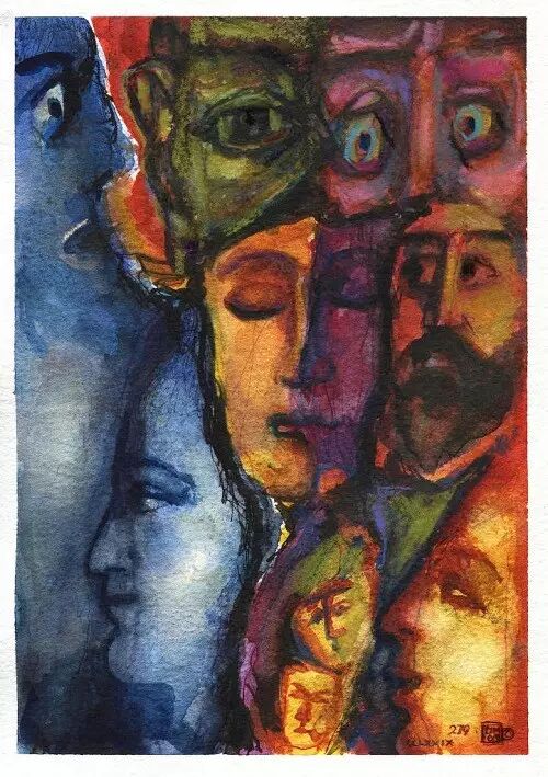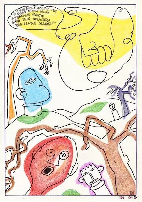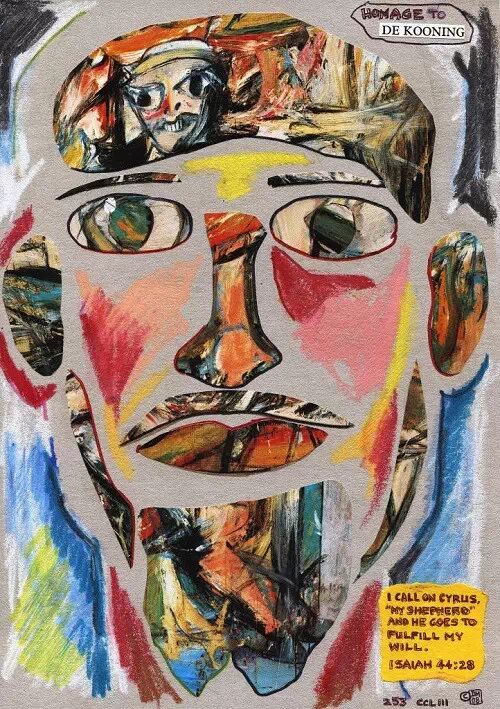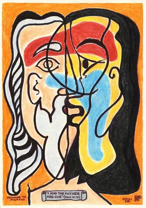 你能猜出这画的是谁吗?引用的《圣经》原文已经提示得很明显了,这画的是上帝和耶稣。作为神之子的耶稣与上帝因目标相同而合为一体了。这奇奇怪怪的脸,很明显是在模仿毕加索。