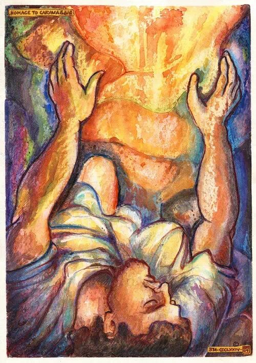 ▲除了现代画家,Dino Mazzoli称他也致敬了古典画家。比如上面这幅插图标明致敬了意大利16世纪末现实主义画家卡拉瓦乔,不过书评君觉得,与卡拉瓦乔相比,Mazzoli的画有很明显的现代感。