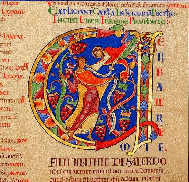 ▲《温彻斯特圣经》插图“上帝向耶利米讲道”,耶利米是犹太国灭国前最黑暗时期的一位祭司、先知,耶利米的语言记录于耶利米书。