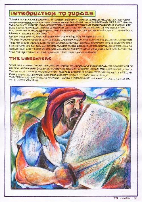 ▲《士师记》介绍,本书记载以色列民入迦南后受外族侵扰和压迫,他们的失败是因为他们离弃神,敬拜偶像,并且行恶,惹耶和华发怒;于是耶和华借助外邦攻击他们,希望他们悔改,然后神兴起士师,将悔改的百姓从仇敌手中拯救出来。在每新一卷的开始,Mazzoli会对这一卷的故事做简单介绍。