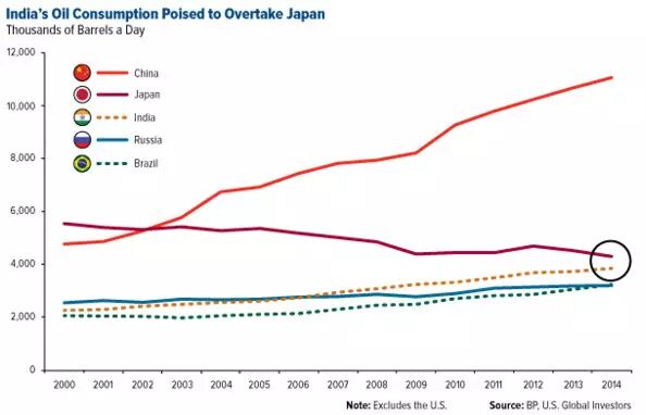 印度的崛起似乎具有很强的戏剧性。从上述图表中你可以看出,2007年至2014年,在印度道路上跑着的汽车数量翻了一番,不仅仅归功于人口的爆炸性增长,还因为印度“支出阶级”的崛起。基于2014年的数据,超过6亿印度人的年龄不满25岁。这部分人中的很多都渴望拥有社会流动性以及“美国梦”。不过,鉴于印度经济活动日益活跃,到2020年该国有望成为继中国和美国之后全球第三大汽车市场。这意味着,印度的石油消费量拥有巨大的上行空间。