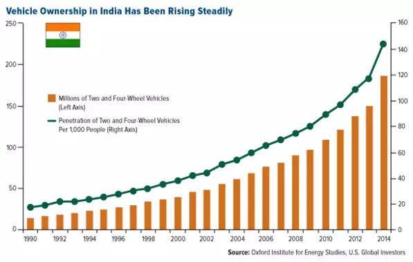 导致印度石油需求蓬勃增长的重要原因是令该国经济表现很像上个世纪九十年代末的中国的政策改变。与其他主要经济体相比,印度的人均石油消费量相对较低,因为机动车和摩托车的拥有量仍在增长。如果单看客车,比率接近是每1000人17辆。在美国,这一比例为每1000人850辆。
