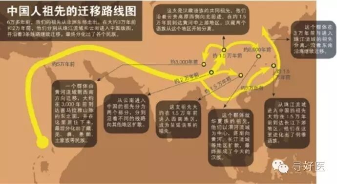 中国科学家的研究表明,中国人的祖先源于东非,经过南亚进入中国。这支南亚先民经过多次迁徙及体内基因突变,逐渐分化成为各个民族。