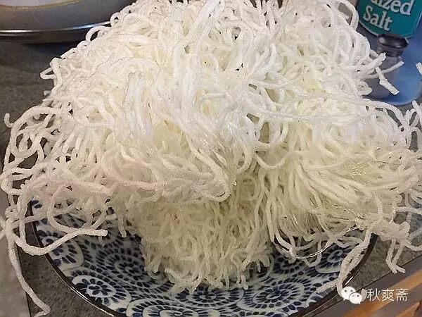 1. 龙口粉丝两小把,起油锅,油要多些,等油温六七成再下(可先掰一小段试一 下,粉丝若马上涨发就够热了)。最好分成几次炸,免得外面发好了,里面没炸到;若等里面也炸到了,外面却有可能变焦啦!我这个也有几处没炸好: