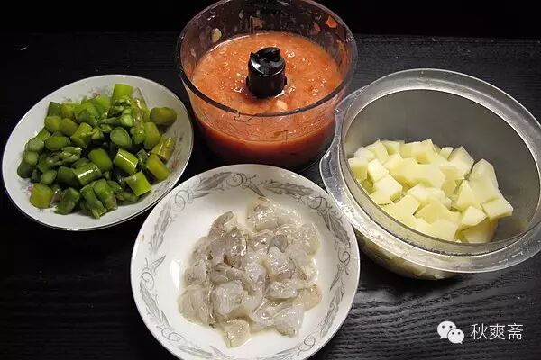 芦笋也事先用水焯过(或微波一分钟),虾仁用点盐料酒淀粉浆过。番茄我用机器打成汁,不用油直接下锅煮开,然后下已经煮熟的土豆煮几分钟。最后把虾放在表面,盖上盖子焖两分钟,开盖加芦笋,然后调味炒匀就可以出锅了(撒了现磨的胡椒面,好香:)