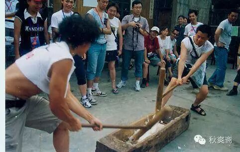 还 有一样家家都做的是糯米粑。这更是个力气活,奶奶一般是请邻居小伙帮忙的。工具是一段整木雕的大木槽,两把大木槌。热腾腾,香喷喷的糯米饭倒进槽中,两个 棒小伙子抡槌,此起彼伏使劲擂着,直到成为黏黏的。然后包入猪油炒的豆沙馅,做成一个个的小圆饼。凉后也是泡在水里保存。吃的时候放在火炉上烤,最好吃是 用油炸,又叫油炸粑。